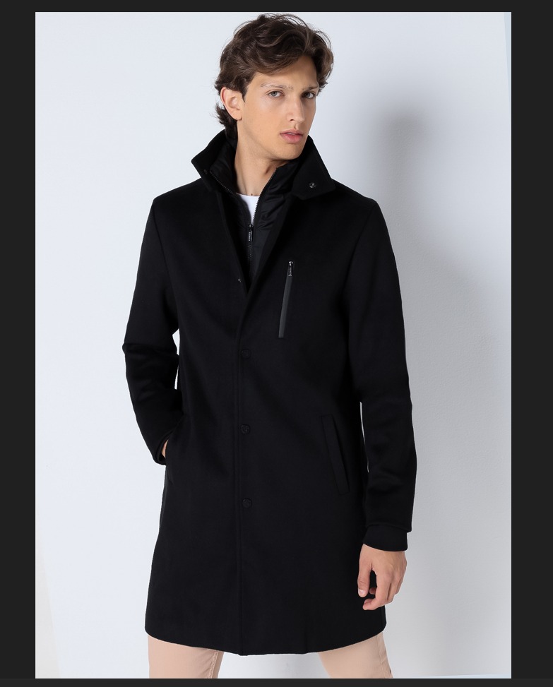 Abrigo negro de paño con efecto chaleco acolchado SIX VALVES. Tallas M L XL.