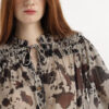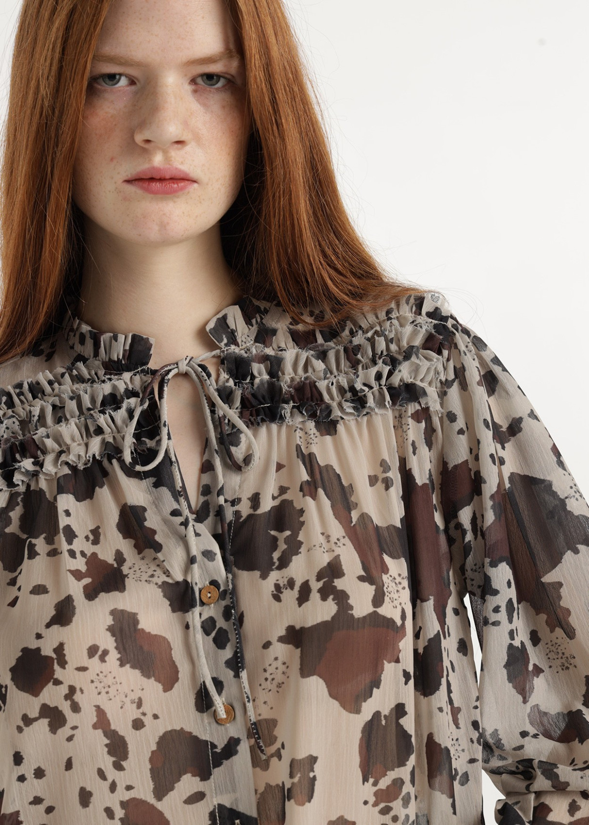Blusa SCARLETT BETTA con estampado de vaca, confeccionada en un tejido suave y semitransparente que aporta comodidad y ligereza. Su diseño incluye un fruncido en el cuello con lazo, detalle que añade un aire moderno y distintivo. Versátil y fácil de combinar, es una prenda ideal para crear looks femeninos y con personalidad en diferentes ocasiones.