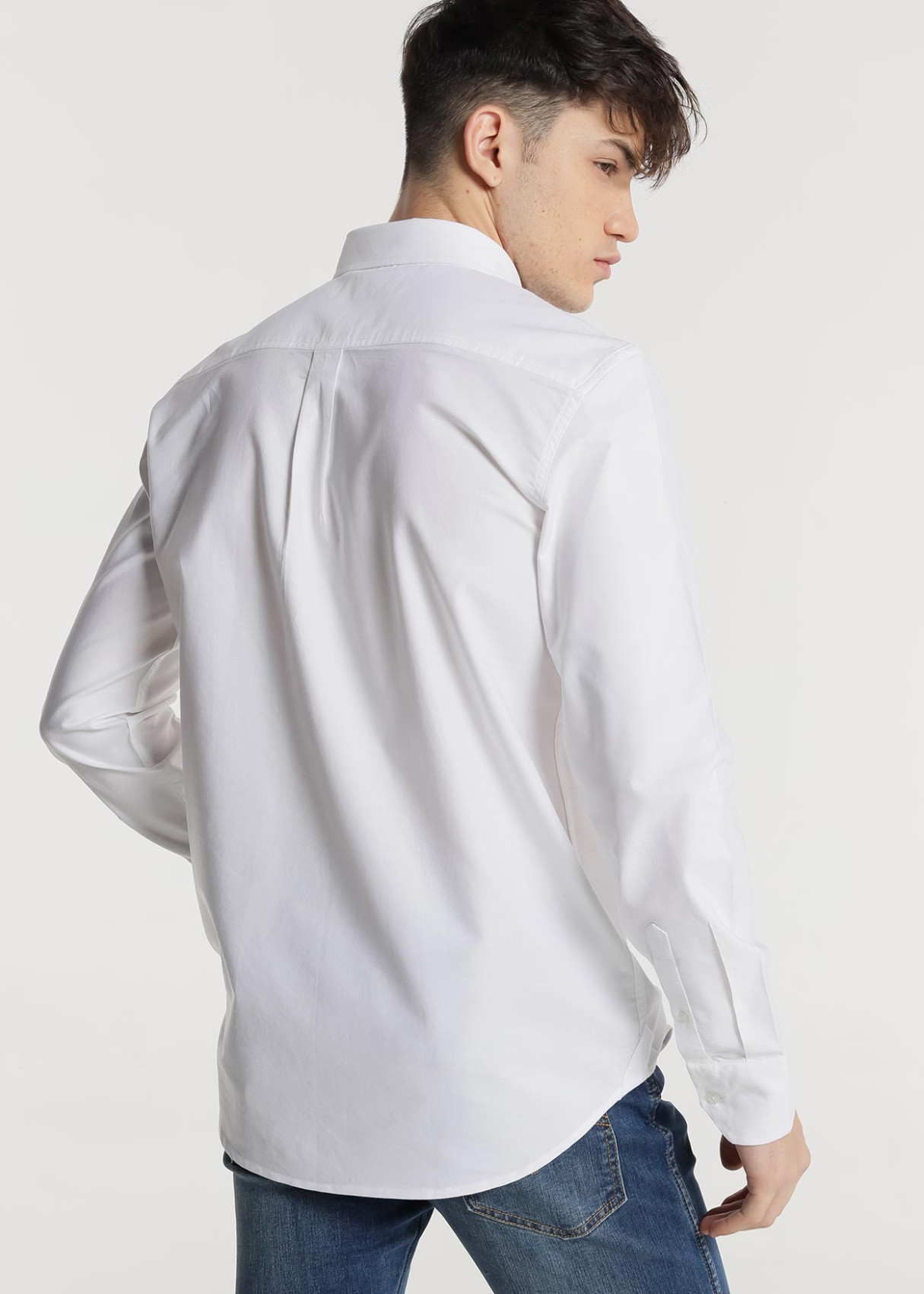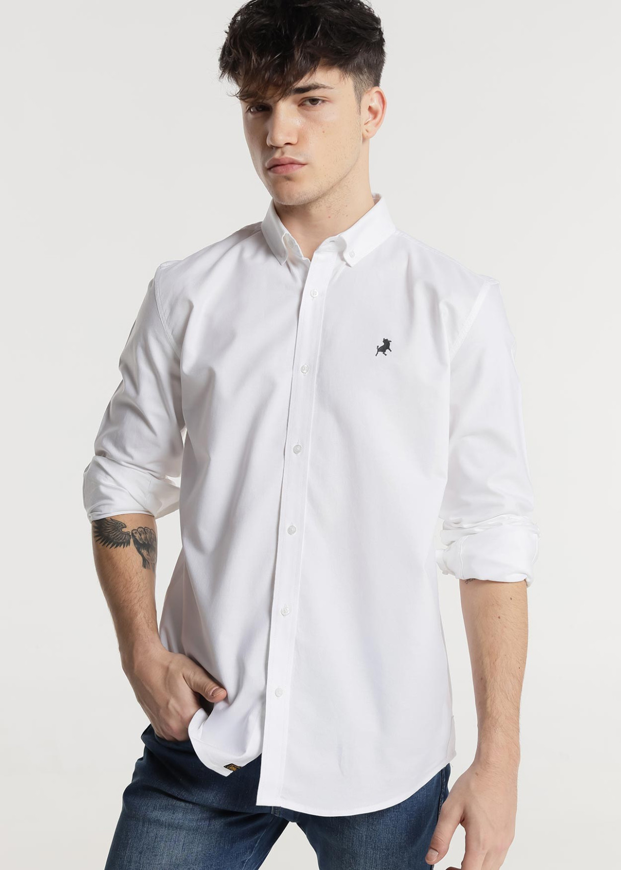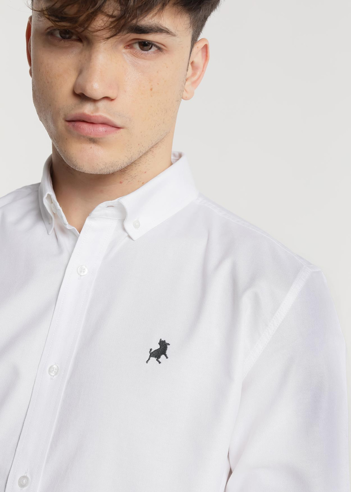 Camisa estilo regular fit para hombre. En color blanco. Cuello solapa y manga larga acabada en puño con botón. Cierre frontal con botones. Detalle logo parte izquierda. Elegante y cómoda.
