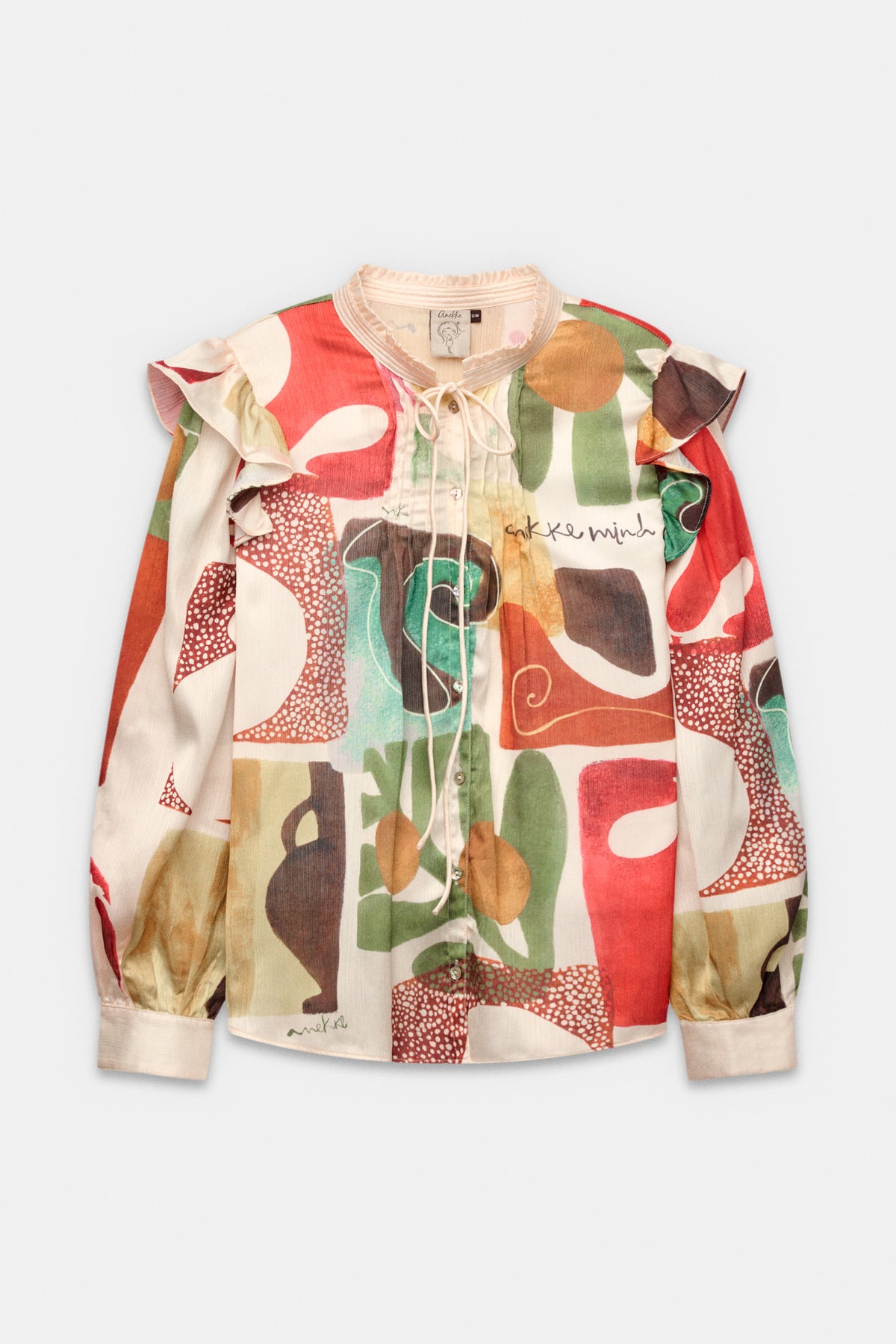 - Camisa de manga larga con tira ajustable en el cuello—para lazo o abertura sutil—y volantito en los hombros que aporta movimiento. El estampado Amphora es el protagonista: delicado, artístico y luminoso. Tejido ligero, caída fluida y silueta favorecedora. Llévala con denim, sastre o falda midi, por dentro o suelta.