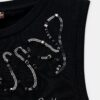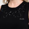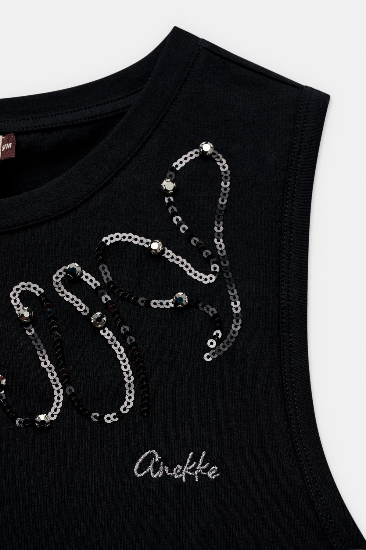 La elegancia del negro con un toque brillante. Esta camiseta sin mangas en color negro destaca por sus detalles de lentejuelas en la parte delantera, que aportan luz y sofisticación a un diseño versátil y cómodo. Perfecta para elevar cualquier look, desde un estilo casual chic hasta una opción más arreglada