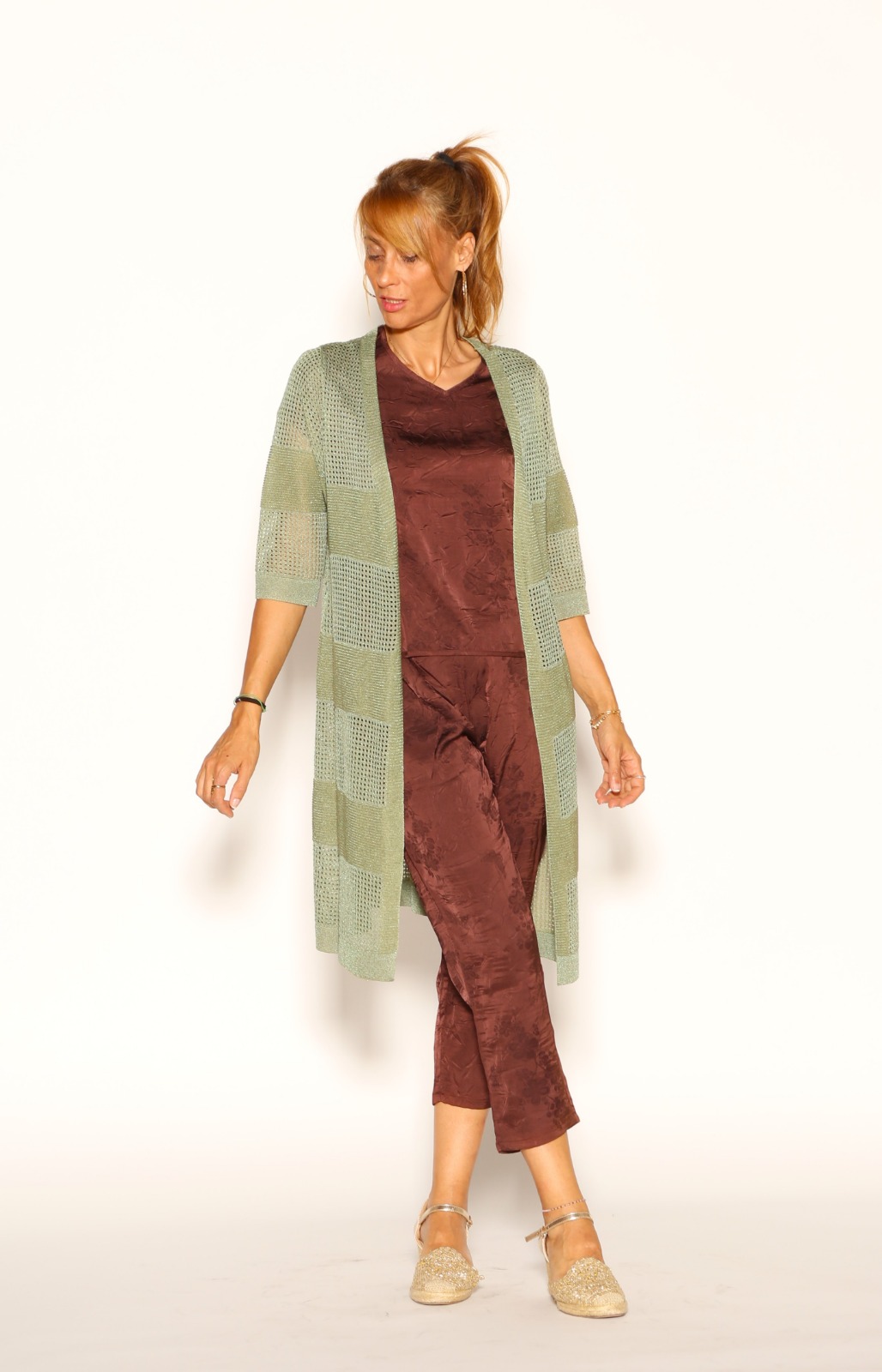 Cárdigan largo de punto calado LEMAILLE. Modelo 8240SK26. Color marrón S M L XL Color verde M L XL..
