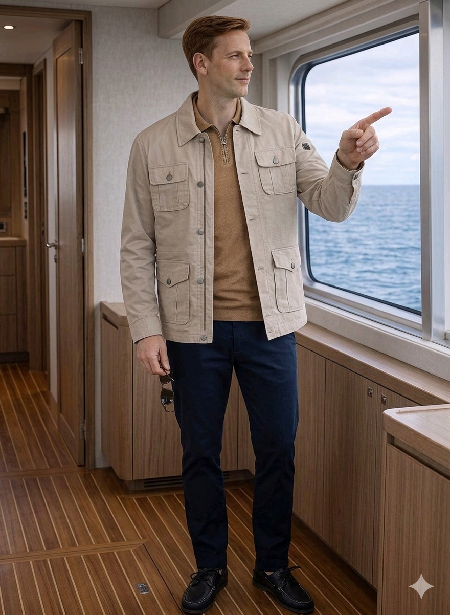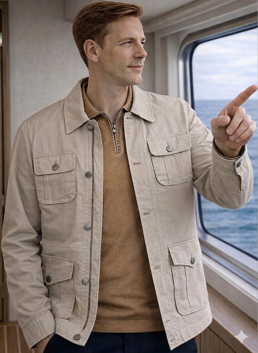 Nota de Estilo: «La sahariana Duck and Fish es la definición de versatilidad. Su color neutro y sus múltiples bolsillos la convierten en la prenda exterior definitiva para quienes valoran la funcionalidad sin renunciar al estilo».