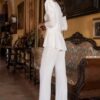 Este traje de Sara Ruiz combina sofisticación y modernidad en una silueta impecable. Con chaqueta cruzada de escote en pico, delicados botones laterales y hombros estructurados, realza la figura con un aire femenino y poderoso. El pantalón recto completa un look perfecto para invitadas que buscan estilo, comodidad y distinción en un solo conjunto.