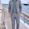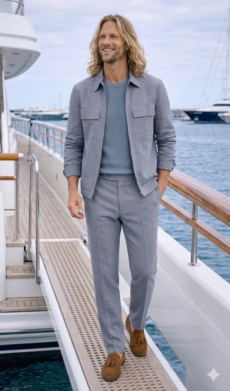 «La armonía perfecta entre texturas. Chaqueta y pantalón efecto lino azul grisáceo con camiseta de punto a tono. Un look monocromático que no pasa desapercibido. ✨👞