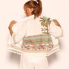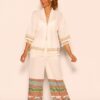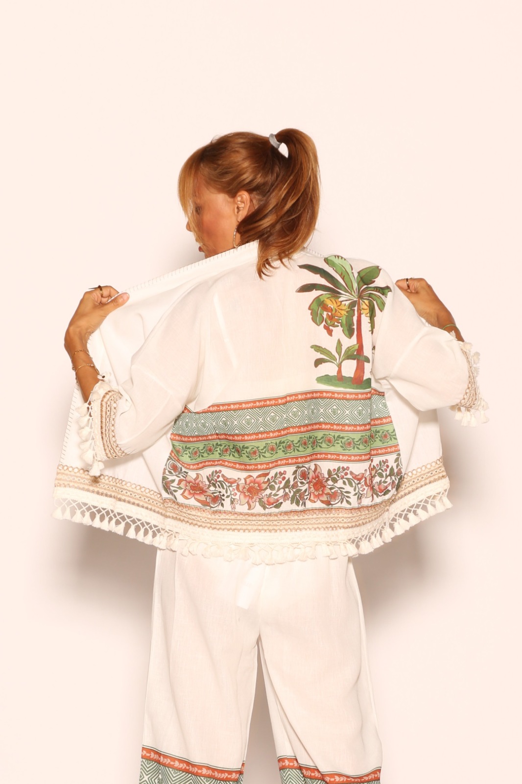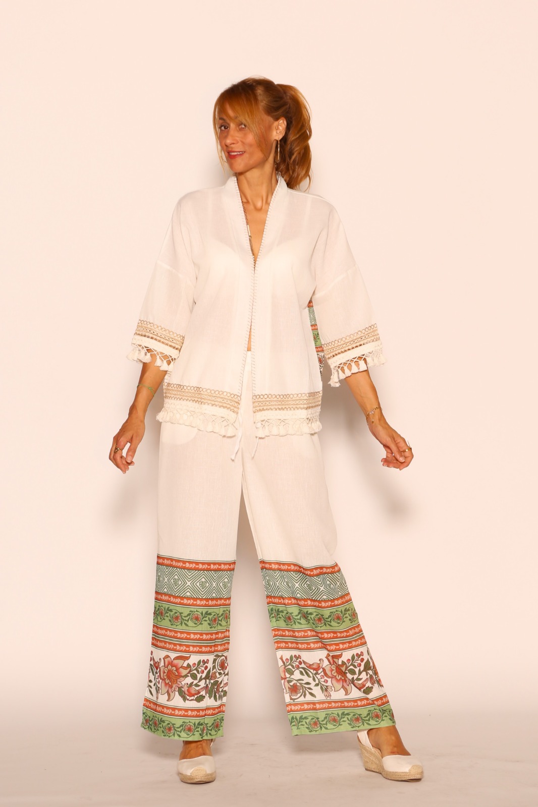 Enamórate de este conjunto de dos piezas en blanco puro. La chaqueta tipo kimono con detalles de flecos y el increíble estampado tropical en la espalda se une a unos pantalones de pata ancha con cenefas florales para crear el look boho-chic definitivo. Fresco, cómodo y absolutamente sofisticado.