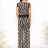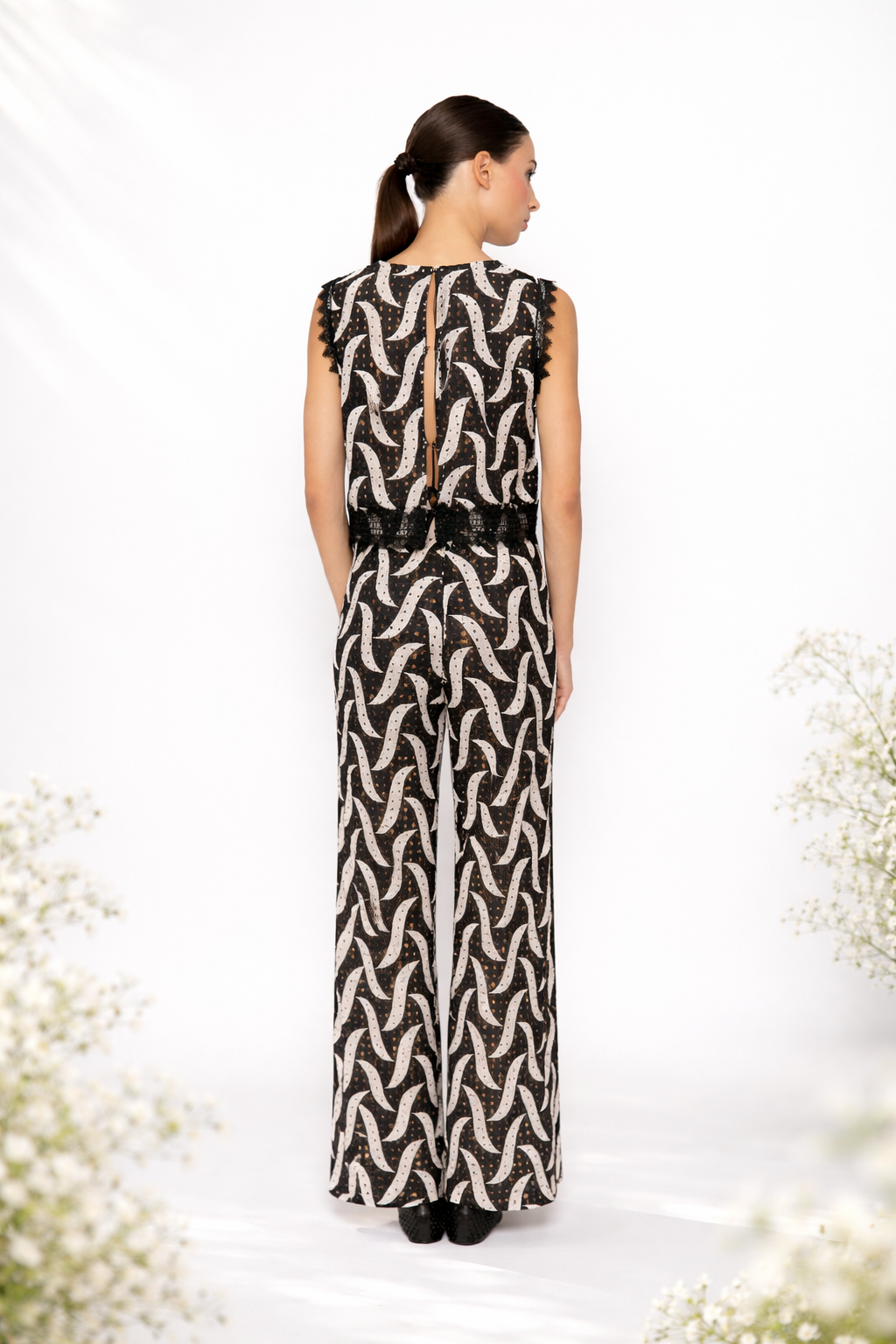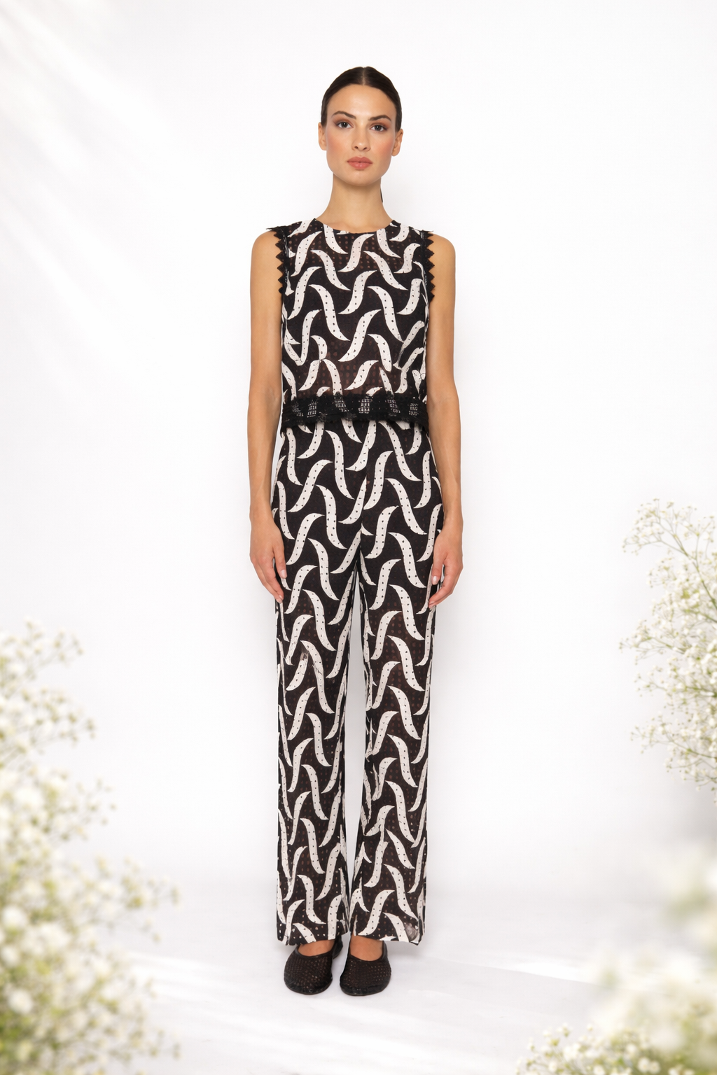 Confeccionado en un tejido ligero y fluido, destaca por su original estampado bicolor de inspiración orgánica que aporta dinamismo y sofisticación al look. El top, de corte recto y sin mangas, incorpora delicados acabados en el bajo que añaden un sutil toque de textura, mientras que el pantalón de pierna amplia estiliza la silueta y garantiza comodidad y movimiento.