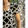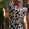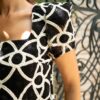 Este conjunto de Sara Ruiz combina sofisticación y diseño en un juego hipnótico de formas geométricas en blanco y negro.