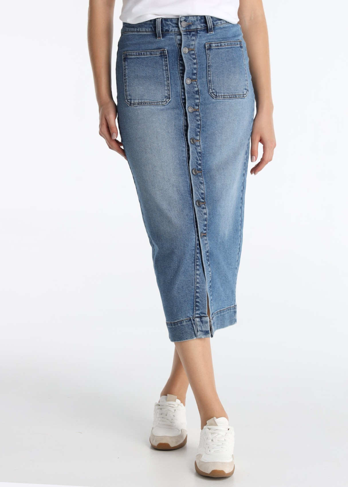 El icono de Lois en falda. Cierre frontal con botones y bolsillos de parche para un look denim auténtico y femenino.