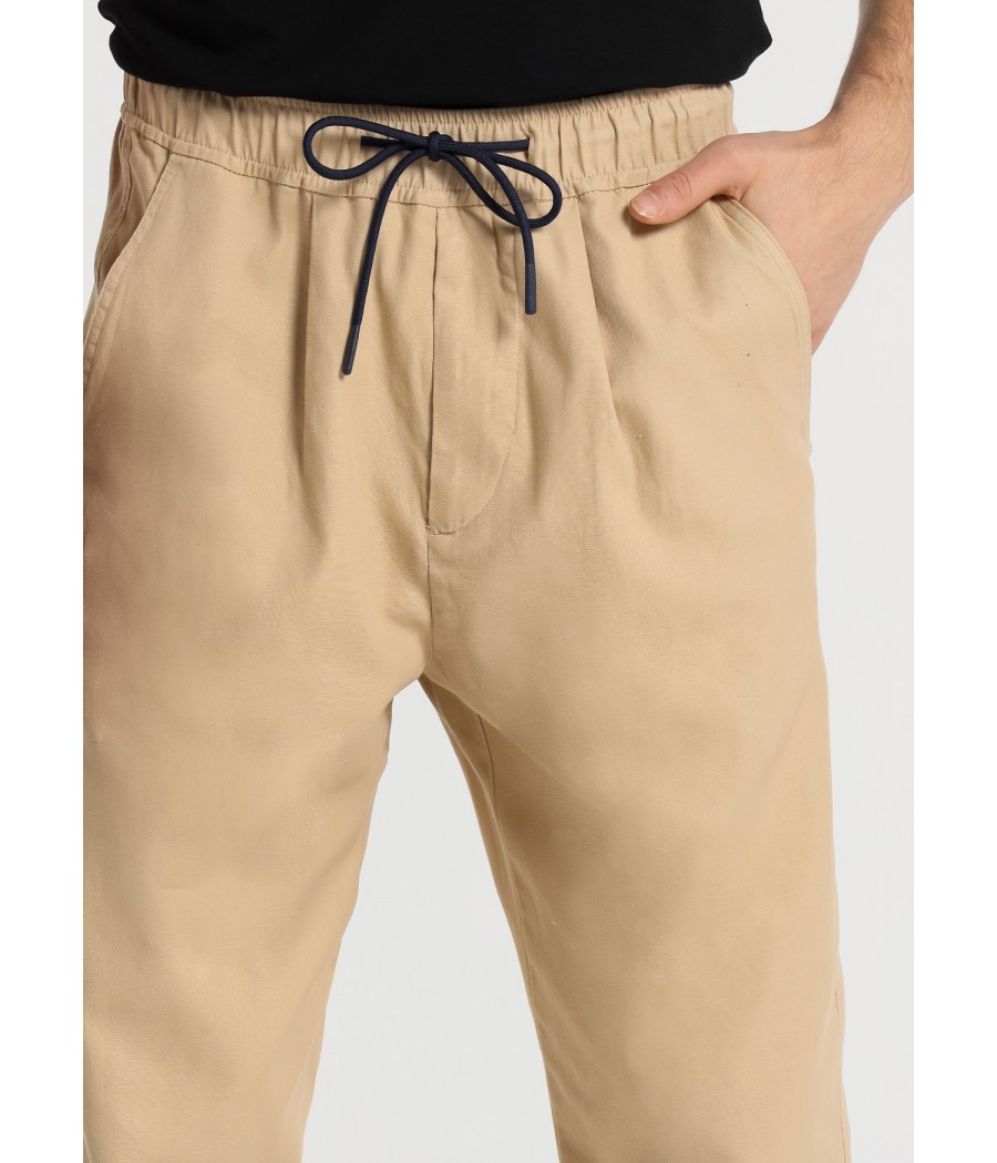 El V&L HOMBRE-Pantalón Chino Slim Tiro Medio Cintura Gomas es una prenda de vestir masculina diseñada para ofrecer comodidad y estilo. Este pantalón presenta un corte slim que se ajusta de manera elegante al cuerpo, destacando una silueta moderna y sofisticada. Su tiro medio proporciona un ajuste equilibrado y cómodo en la cintura, la cual está equipada con gomas elásticas para un ajuste flexible y seguro. Confeccionado en un 100% de algodón, este pantalón garantiza suavidad y transpirabilidad, ideal para el uso diario. El color marrón añade un toque clásico y versátil, adecuado para diversas ocasiones y combinaciones de vestuario.