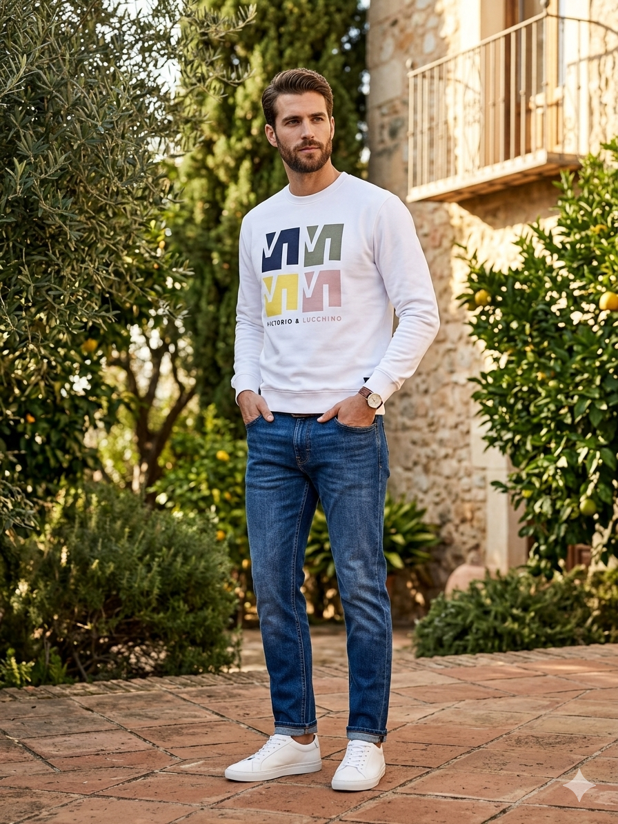 Eleva tu estilo casual con esta sudadera de cuello redondo, una pieza clave de la nueva colección de Victorio & Lucchino. Destaca por su diseño limpio en color blanco óptico, que sirve de lienzo para un gráfico frontal moderno y lleno de personalidad.