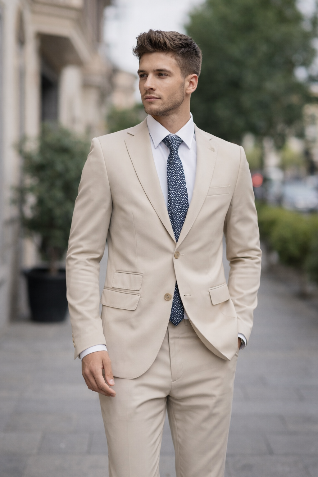 Elegante traje de la firma Diprego en tono beige, una opción sofisticada y versátil para eventos, celebraciones o looks formales de temporada. Su americana de corte entallado con solapa clásica y cierre de dos botones estiliza la silueta, mientras que el pantalón de línea recta aporta equilibrio y comodidad. Confeccionado en un tejido ligero y refinado, es perfecto para primavera y verano, combinando a la perfección con camisa blanca y corbata para un estilo moderno y distinguido.