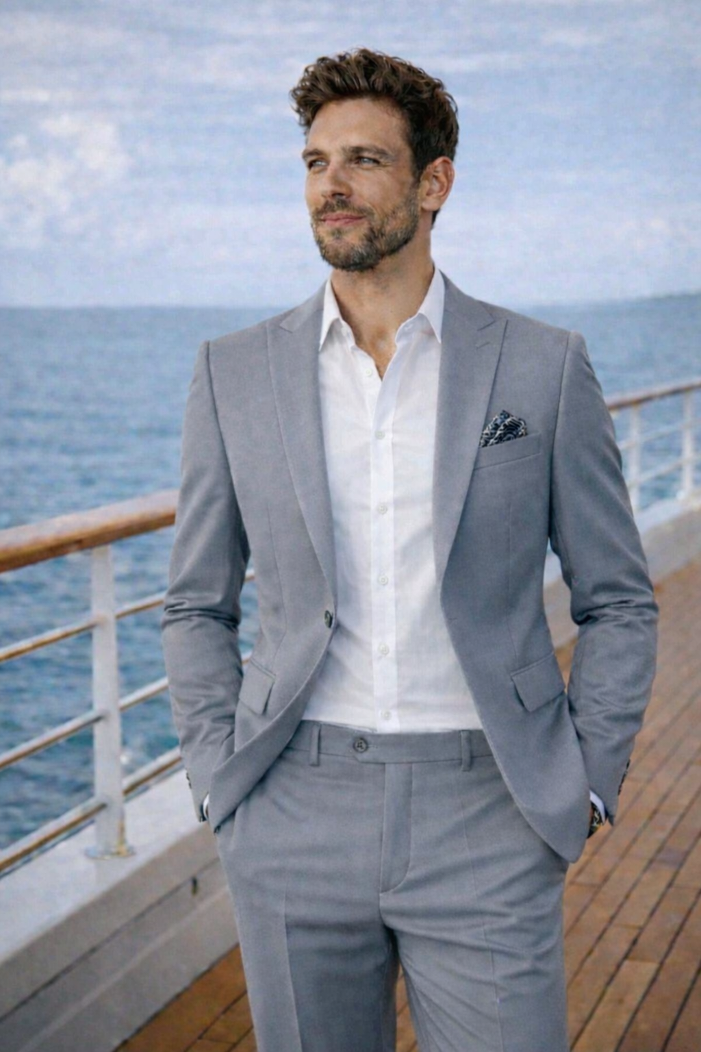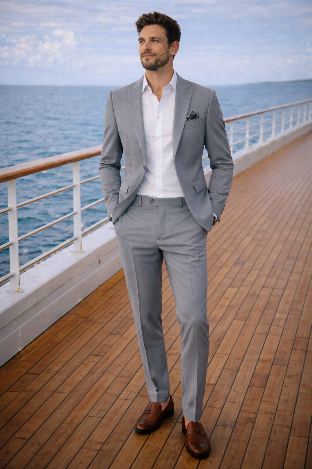 Traje de la firma Dark & Fit confeccionado en un elegante tono gris claro, perfecto para un estilo sofisticado y actual. Su americana de corte entallado realza la silueta masculina, combinando a la perfección con el pantalón de líneas limpias y ajuste impecable. La camisa blanca aporta frescura y contraste, mientras que los detalles como el pañuelo en el bolsillo elevan el conjunto con un toque distinguido.