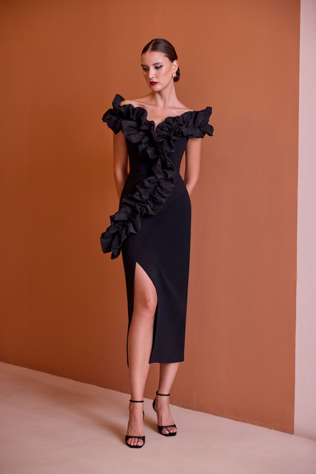 Este vestido de Carla Ruiz es la definición de sofisticación con carácter. Confeccionado en un elegante color negro, destaca por su espectacular volante central en cascada que recorre el escote y el frontal, aportando movimiento, volumen y un aire artístico irresistible.