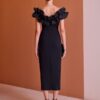 El escote bardot realza los hombros y el cuello con una sensualidad muy fina, mientras que su silueta entallada estiliza la figura sin perder comodidad. La abertura frontal añade un toque atrevido y femenino, perfecto para alargar visualmente las piernas y darle dinamismo al diseño.
