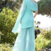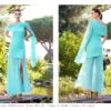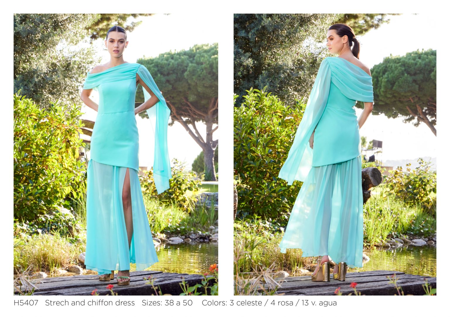 Vestido de la firma Herysa en un elegante tono verde agua que destaca por su diseño sofisticado y femenino. Presenta escote asimétrico con delicado drapeado y una caída de gasa que aporta movimiento y ligereza. La falda fluida con abertura frontal estiliza la silueta y añade un toque de elegancia, convirtiéndolo en una opción ideal para bodas, graduaciones o eventos especiales.