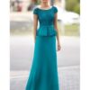 Vestido Carla Ruiz largo confeccionado en crepe truquesa con cuerpo de encaje al tono con piedrecitas, escote redondo, manga casquillo y corte peplum …