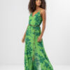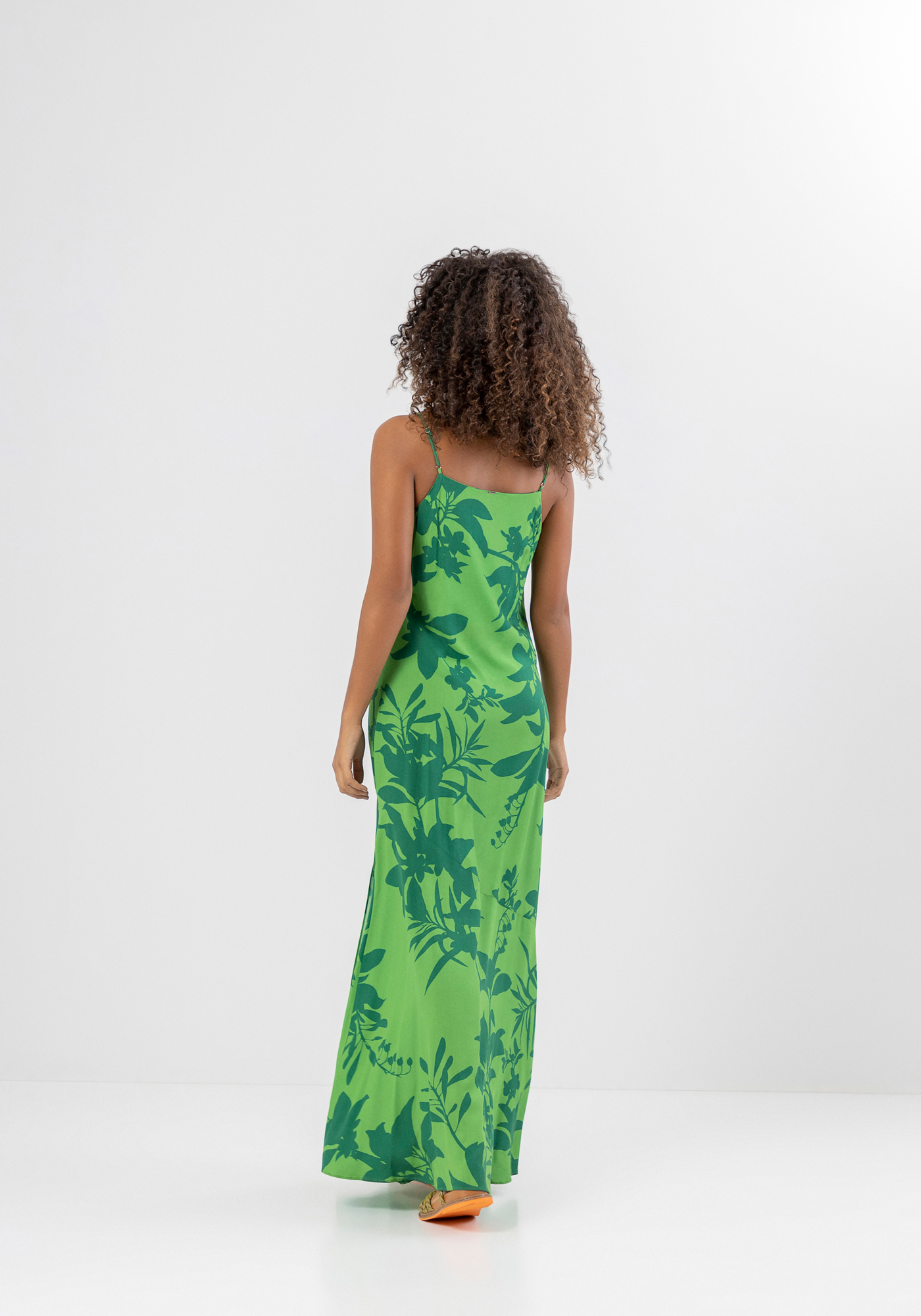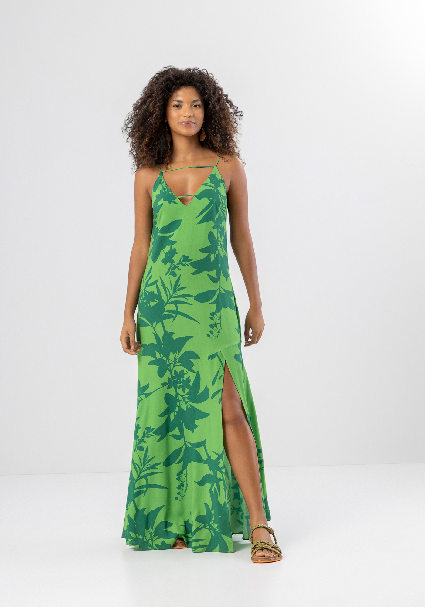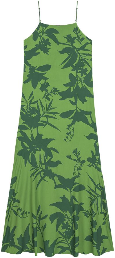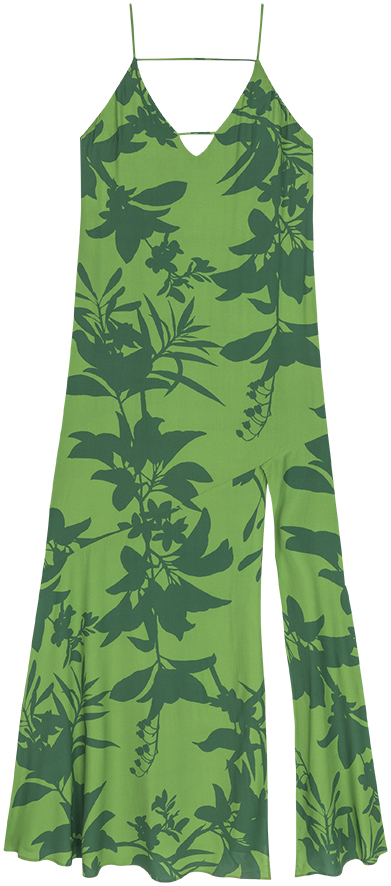 Confeccionado en rayón balinés, viscosa tradicional de tacto suave y caída fluida. Pieza de la colección Florestar con estampado rotatorio (pueden variar los elementos), largo largo, corte holgado, escote en V con detalle de tiras, tirantes ajustables y abertura frontal.