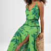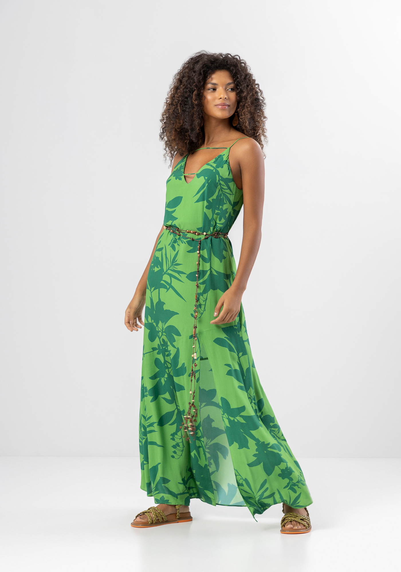 Descubre la belleza de la naturaleza con este vestido midi de viscosa, cuyo estampado te invita a conectar con la selva brasileña. Con una abertura delantera, explora la elegancia con movimiento y un toque de sensualidad. Combínalo con accesorios coloridos para un look único.