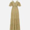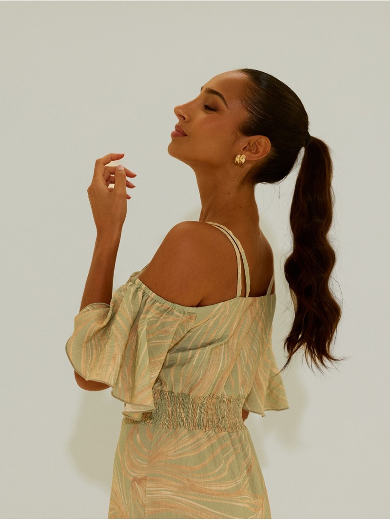 - Escote y Mangas: Presenta un elegante escote en V acompañado de tirantes finos dobles y un sofisticado diseño de hombros descubiertos (cold shoulder) con mangas cortas tipo volante.