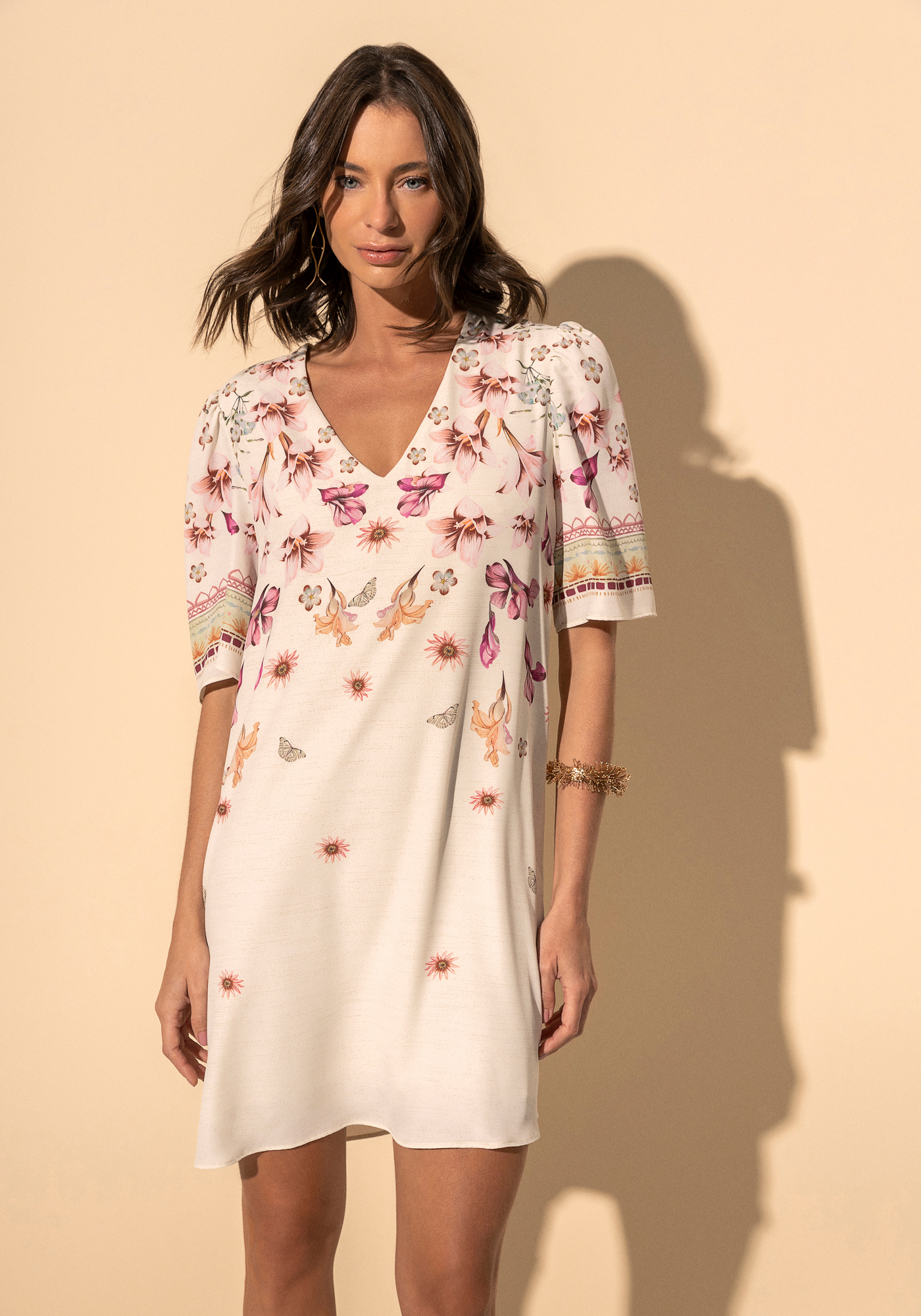 Fabricado en tejido resistente a las arrugas, caída ligera, forro de viscosa, largo corto, mangas cortas, escote en pico.
