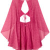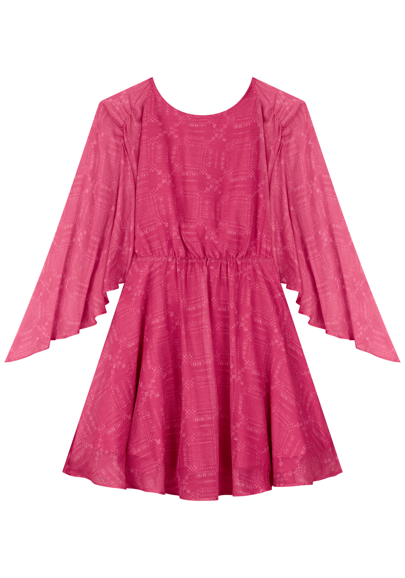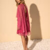 Vestido corto y fluido con mangas anchas y detalles transparentes.