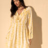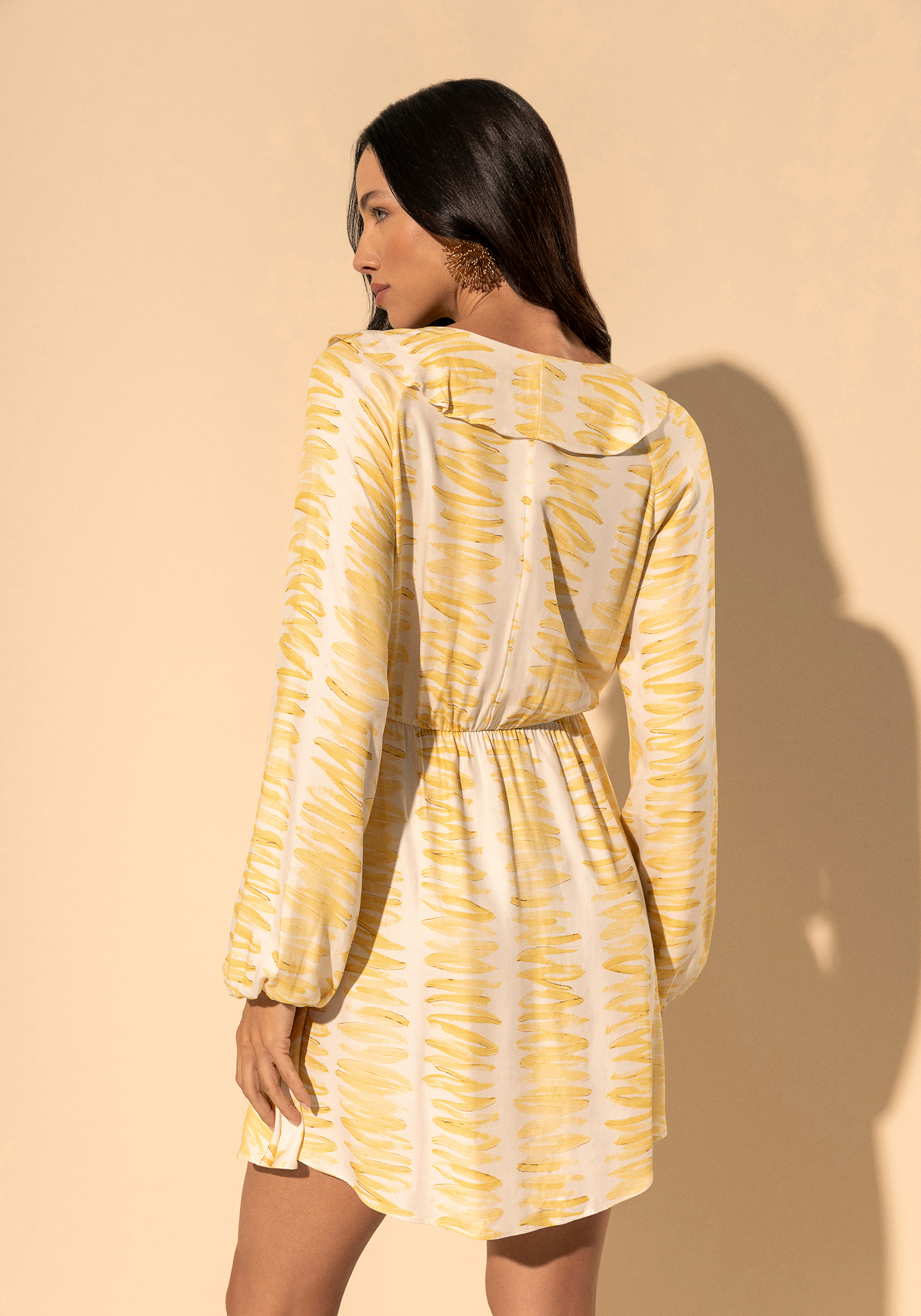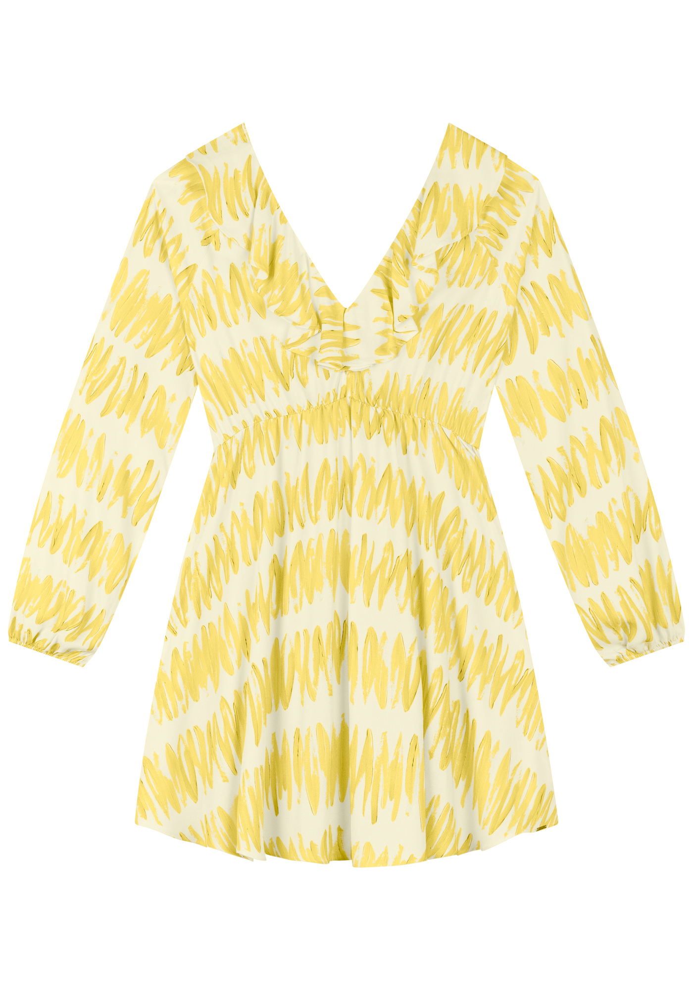 Vestido corto estampado con mangas largas y volantes Con un escote en V delicadamente adornado con volantes, este vestido corto estampado ofrece un encanto único. La cintura elástica realza la silueta, aportando sofisticación y comodidad en una sola pieza. Confeccionado con viscosa responsable, tejido ligero, tacto suave, largo corto, mangas largas, escote en V con volantes y cintura elástica.