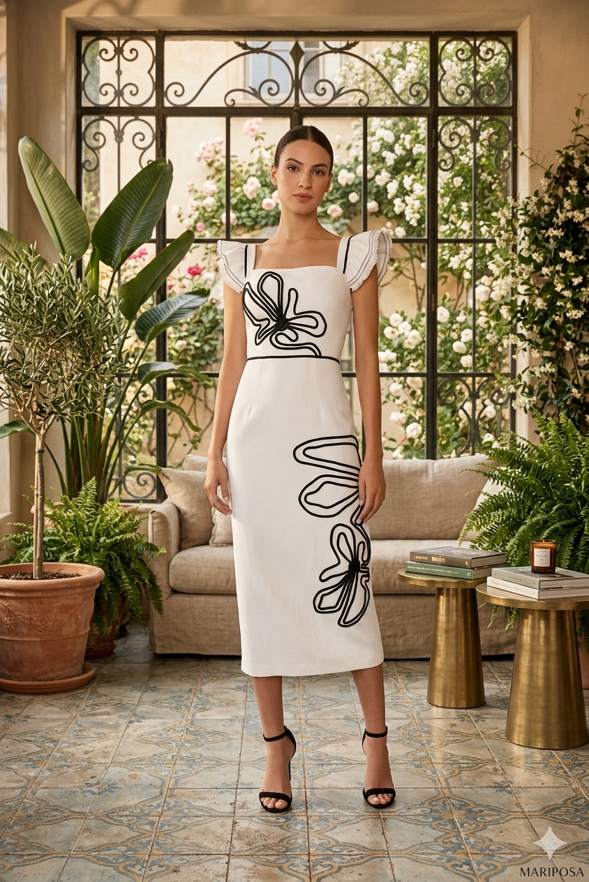 - Bordado Artístico: El verdadero protagonista es el bordado de cordón negro en forma de flores abstractas, dispuesto de manera asimétrica sobre el cuerpo y la falda, creando un contraste visual impactante sobre el blanco roto del tejido.