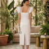 - Escote y Mangas: Presenta un favorecedor escote cuadrado enmarcado por delicadas mangas de volante con detalle de ribete en contraste, aportando un toque romántico y estructurado.