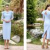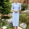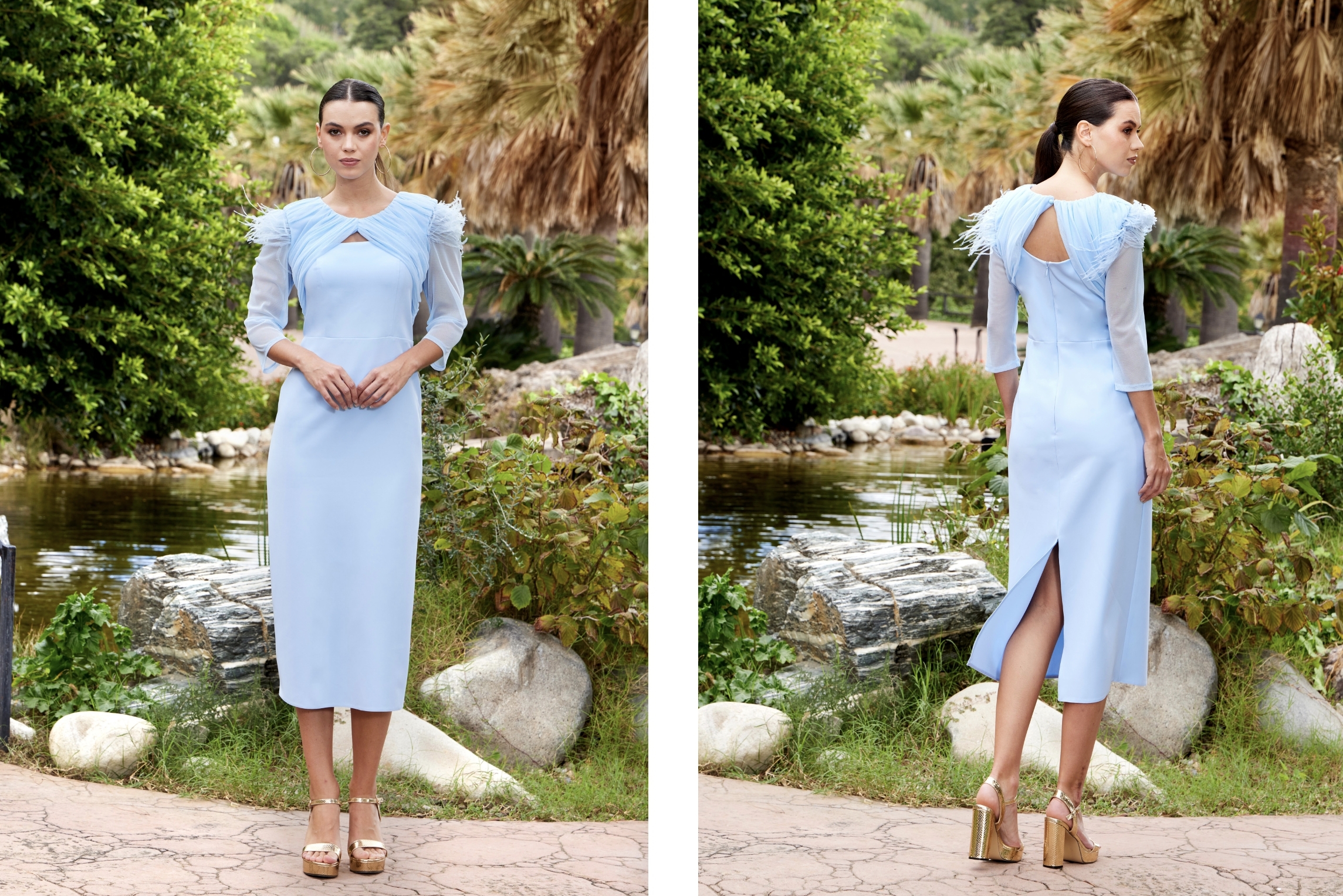 Vestido midi de invitada en tono celeste, confeccionado en tejido stretch que realza la silueta con elegancia y sofisticación. Su diseño incorpora delicado tul drapeado en la parte superior y mangas semitransparentes, con sutiles detalles plumados en los hombros que aportan un toque exclusivo. En la espalda destaca una abertura en forma de lágrima y una discreta abertura inferior que facilita el movimiento. Ideal para bodas y eventos especiales.