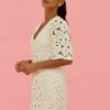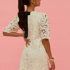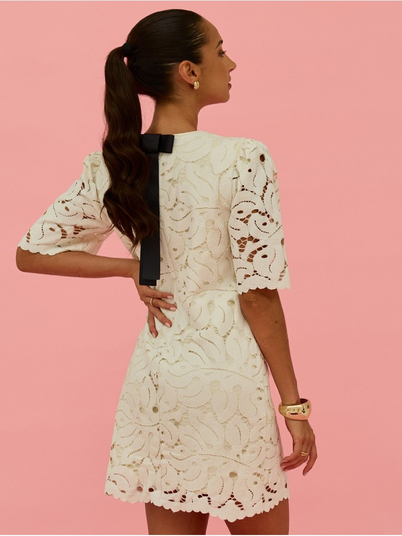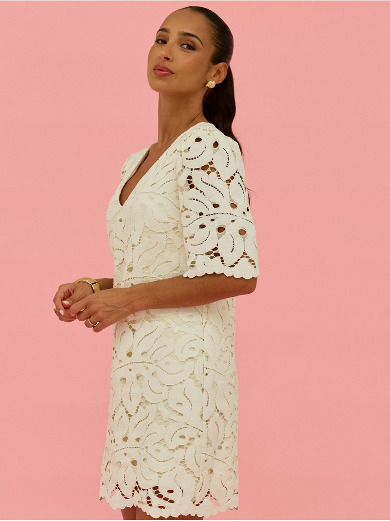 Este elegante vestido mini destaca por su exquisito diseño en guipur calado, ofreciendo una estética romántica y sofisticada ideal para eventos de día, cócteles o celebraciones especiales.